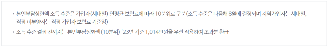 ① 과도한 의료비로 인한 가계 경제에 부담을 덜어주기 위해 가입자가 부담한 연간(매년 1.1~12.31) 건강보험 본인일부 부담금 총액이 본인부담 상한액을 초과하는 경우 초과액을 공단에서 부담하는 제도를 말합니다.