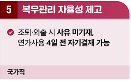 • 이외에도 복무관리 자율성 제고 및 불가피한 초과근무 시 대체휴무 사용 권고토록 했습니다.