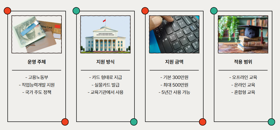 국민내일배움카드는 고용노동부에서 운영하는 직업훈련 지원 제도예요. 이름처럼 ‘내일을 준비하는 국민’이라면 누구나 신청할 수 있는데요. 교육훈련 과정에 필요한 수강료를 카드 형태로 지원해주는 방식입니다. 실물카드가 발급되며, 오프라인·온라인 훈련기관에서 교육을 들을 수 있어요.