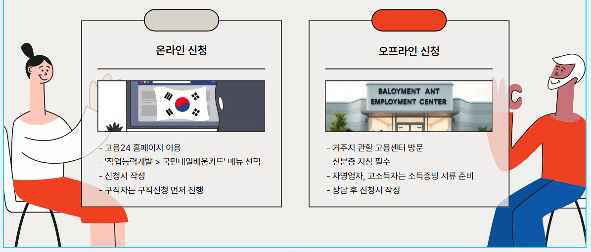 국민내일배움카드 신청은 온라인과 오프라인 모두 가능해요. 대표적으로 고용노동부 통합포털인 고용24 홈페이지를 통해 비대면 신청이 가능하답니다.