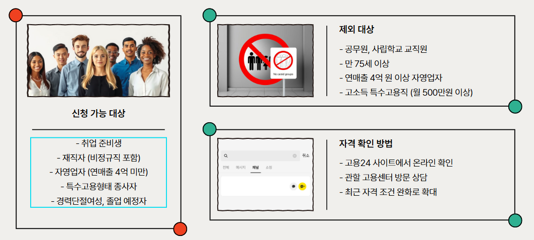 최근에는 자격 조건이 완화돼 이전에 제한됐던 분들도 새롭게 신청이 가능한 경우가 많아졌어요. 고용24 사이트에서 본인의 자격 여부를 확인해보는 걸 추천드려요.