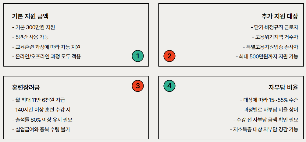 기본 지원 한도는 300만 원이고, 특정 조건을 충족하면 최대 500만 원까지 지원이 가능해요. 단, 수강료 전액이 아닌 일부 자부담이 발생할 수 있고, 그 비율은 대상에 따라 15~55% 수준으로 달라집니다.