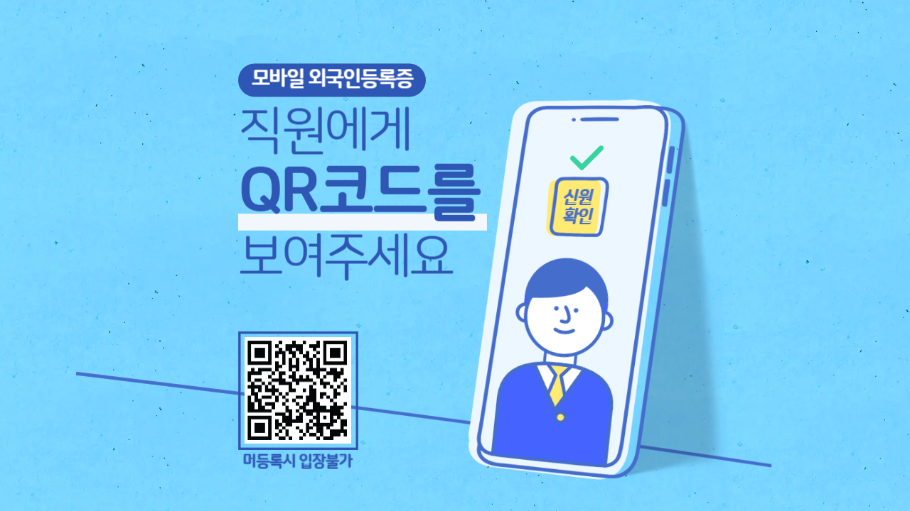 - 전자칩 내장 신형 외국인 등록증을 소지한 경우에는 모바일 신분증 앱을 이용하여 쉽게 모바일 외국인등록증을 발급받을 수 있으나 기존 외국인등록증을 소지한 경우에는 출입국 외국인관서에 방문하여 스마트폰으로 신원확인 큐알코드(QR)를 촬영하여야만 발급이 가능합니다.