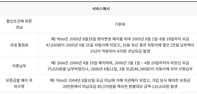 - 유, 무선 서비스 가입자가 해지(번호이동 해지 포함)하는 경우에 해지 시점까지의 이용 요금을 정산하고 있으나 정산 이후 요금할인 등에 따라 과납요금, 보증금과 같은 선납금 미수령 금액이 발견되어 반환하고자 하는 금액을 말합니다.