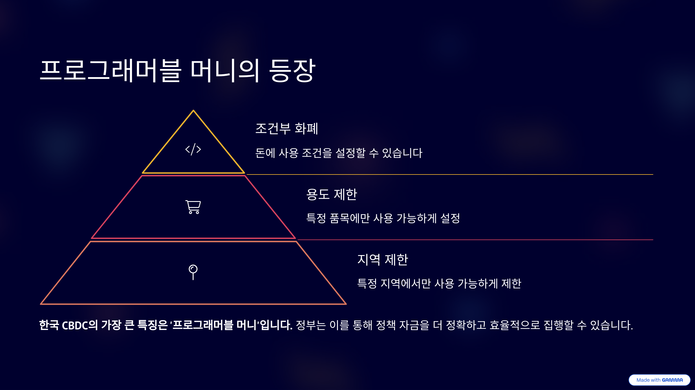 한국 CBDC가 가진 가장 큰 특징 중 하나는 '프로그래머블 머니'라는 개념이다. 쉽게 말해, 돈에 조건을 붙일 수 있다는 의미다. 예를 들어 어떤 지원금은 식료품에만 사용되도록 설정하거나, 특정 지역 안에서만 사용할 수 있게 제한할 수 있다.