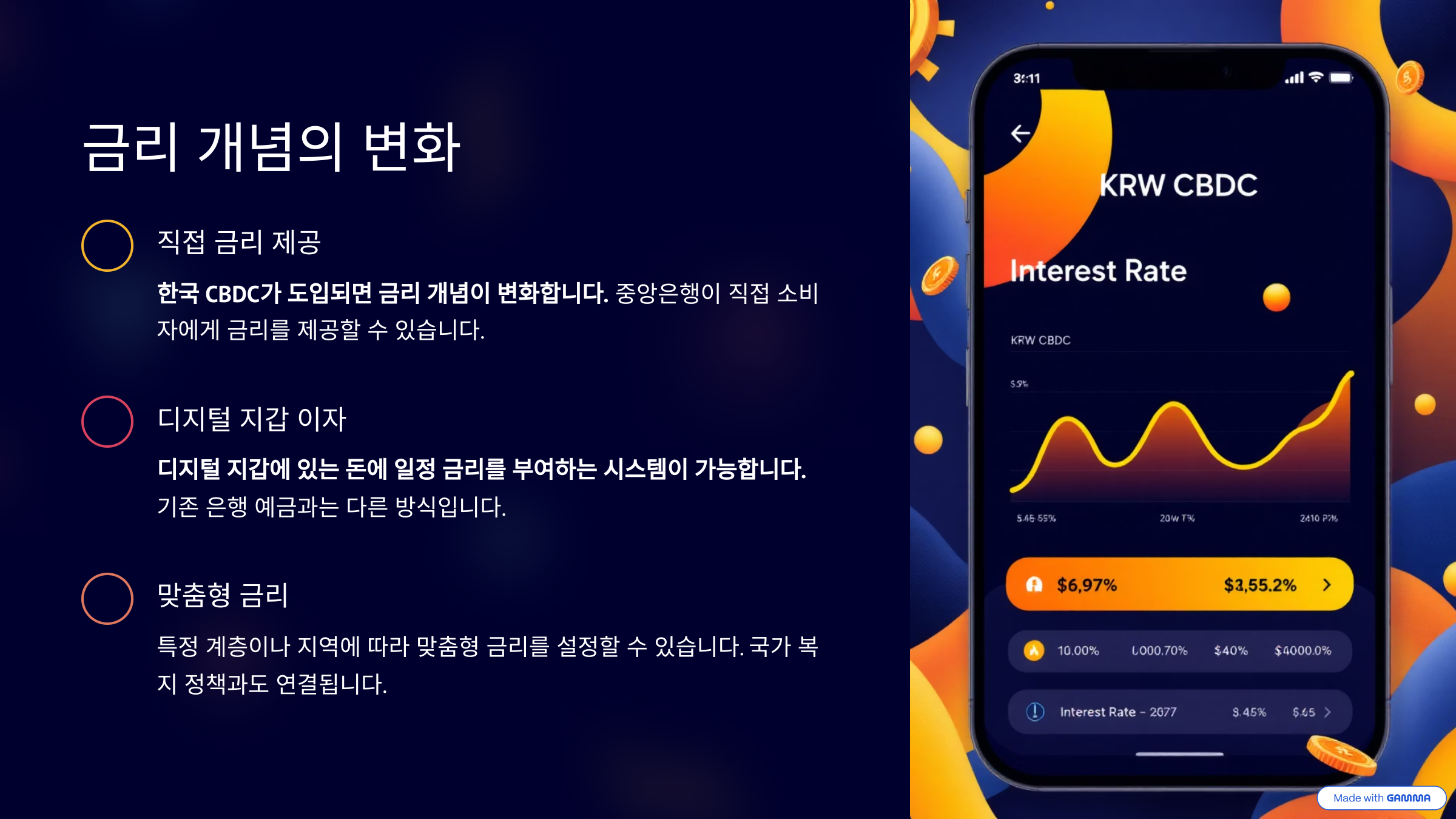 한국 CBDC가 도입되면, 기존의 금리에 대한 개념도 변화할 수 있다. 지금은 은행에 예금을 넣고 이자를 받는 구조지만, 디지털 화폐 시대에는 중앙은행이 직접 소비자에게 금리를 제공하는 방식이 등장할 수 있다. 예를 들어 디지털 지갑에 있는 돈에 대해 일정 금리를 부여하는 시스템이 구현될 가능성이 있다.