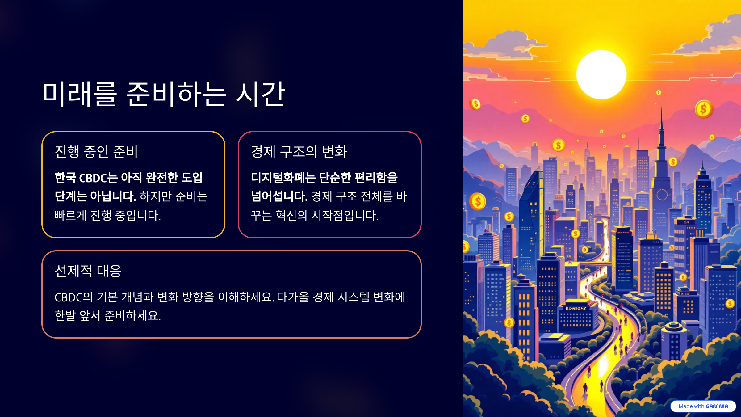 한국 CBDC는 아직 완전한 도입 단계는 아니지만, 준비는 빠르게 진행 중이다. 디지털화폐는 단순히 편리함을 제공하는 기술이 아니라, 경제 구조 전체를 바꾸는 혁신의 시작점이다. 이 글을 통해 CBDC의 기본 개념과 변화의 방향성을 이해하고, 앞으로 다가올 경제 시스템 변화에 한발 앞서 준비해보길 바란다.