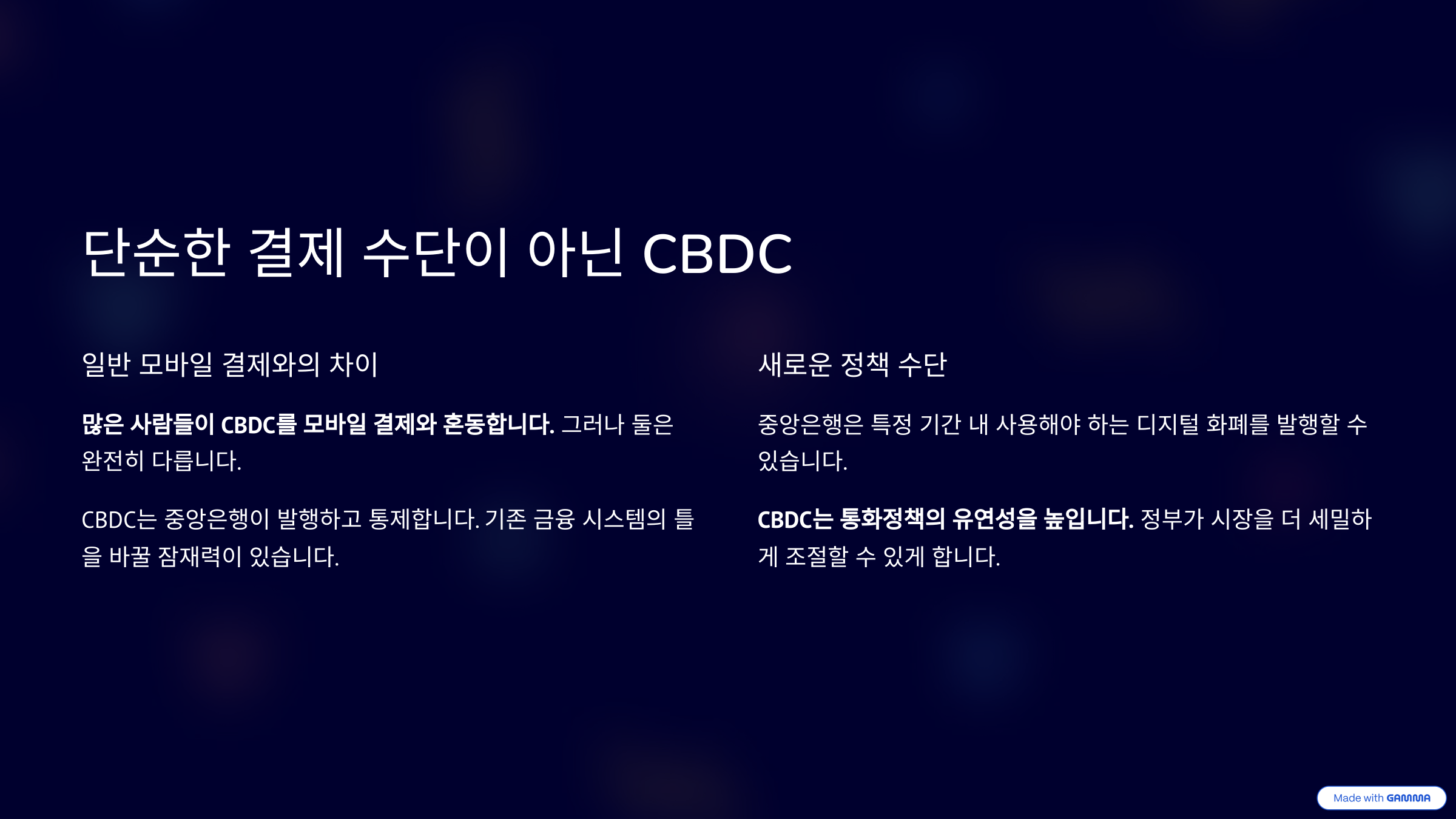이처럼 CBDC는 통화정책의 유연성을 높이고, 정부가 시장을 더 세밀하게 조절할 수 있는 새로운 수단이 된다. 단순히 앱을 통한 결제를 넘어, 경제의 속도와 방향을 바꿀 수 있는 기능을 갖추고 있다는 점에서 CBDC의 등장은 큰 의미가 있다.