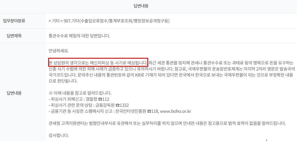 최근 사례(2025년 4월) - 관세청 고객센터 피싱 의심 문의 답변