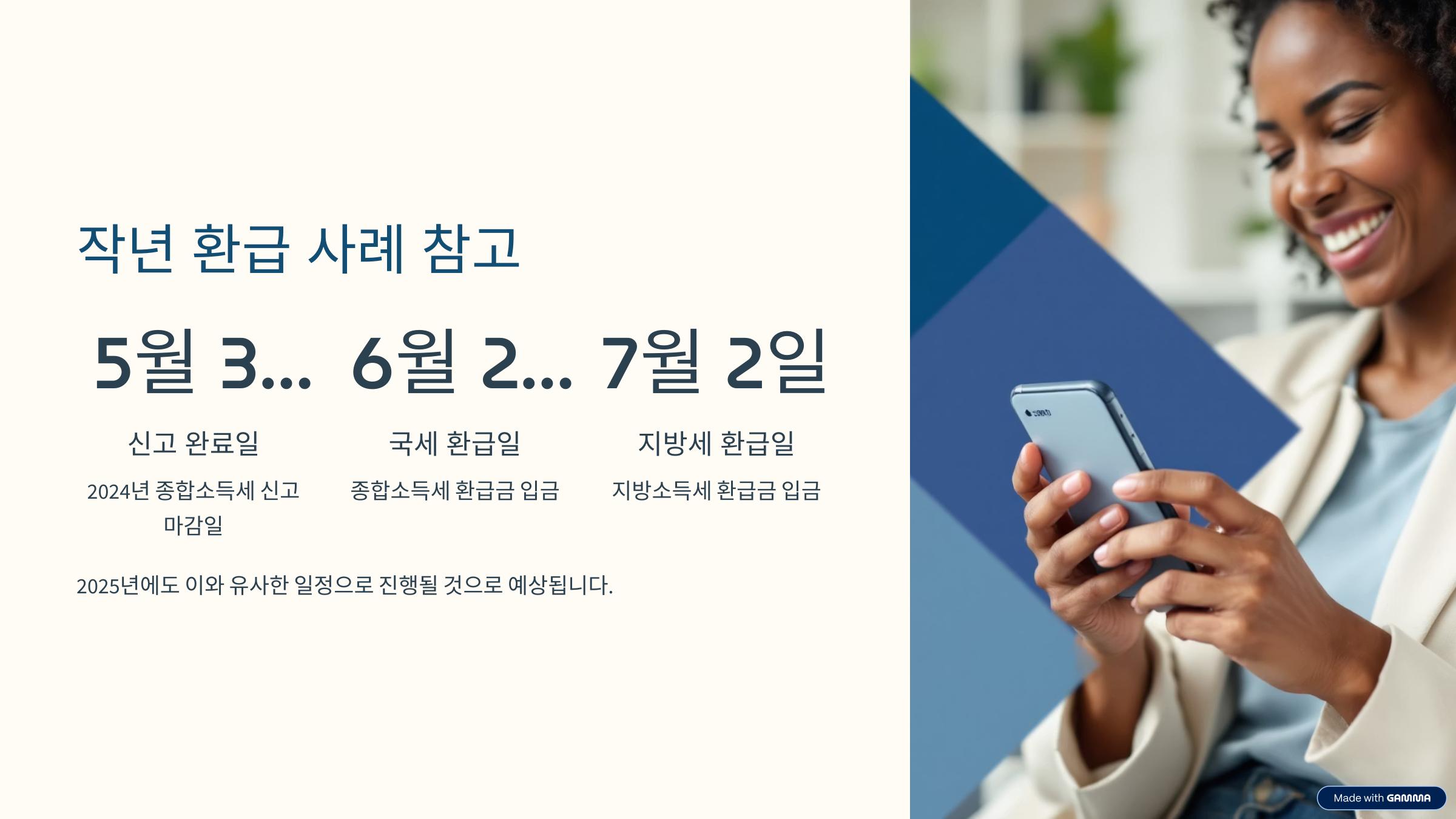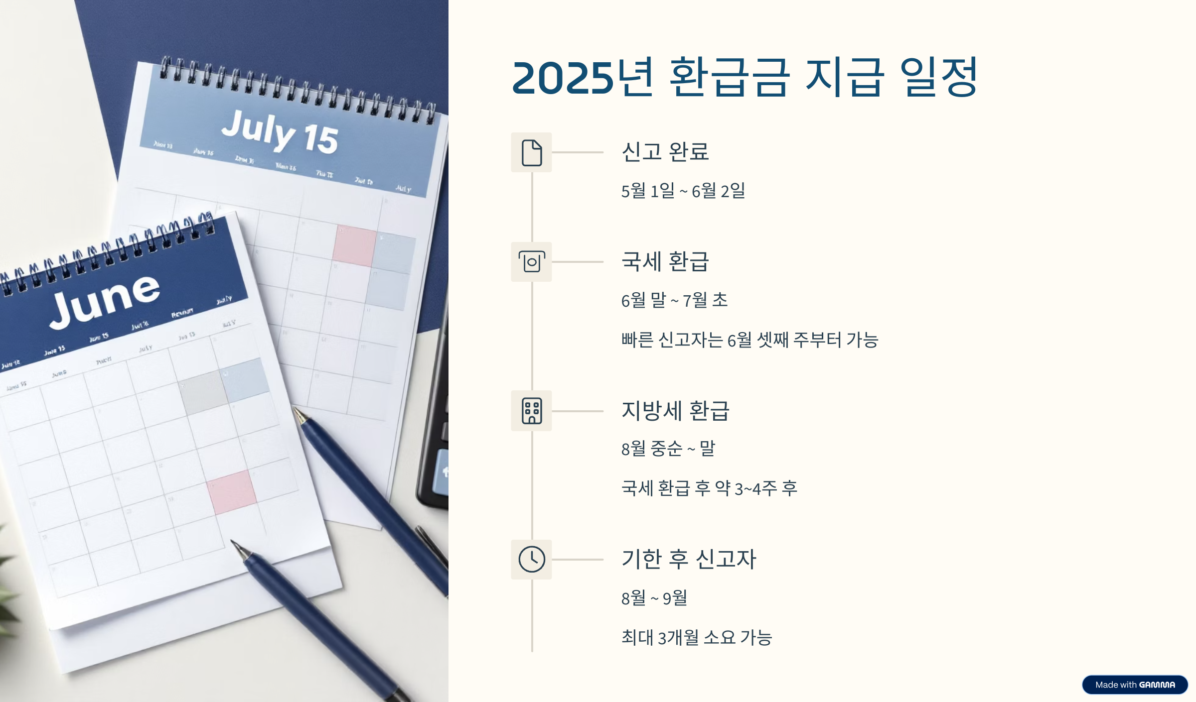 이런 흐름을 고려하면 2025년에도 비슷한 일정이 될 가능성이 높습니다. 다만, 환급일은 각 개인의 신고일, 내용, 세무서 처리 속도 등에 따라 차이가 생길 수 있다는 점은 참고하셔야 해요.