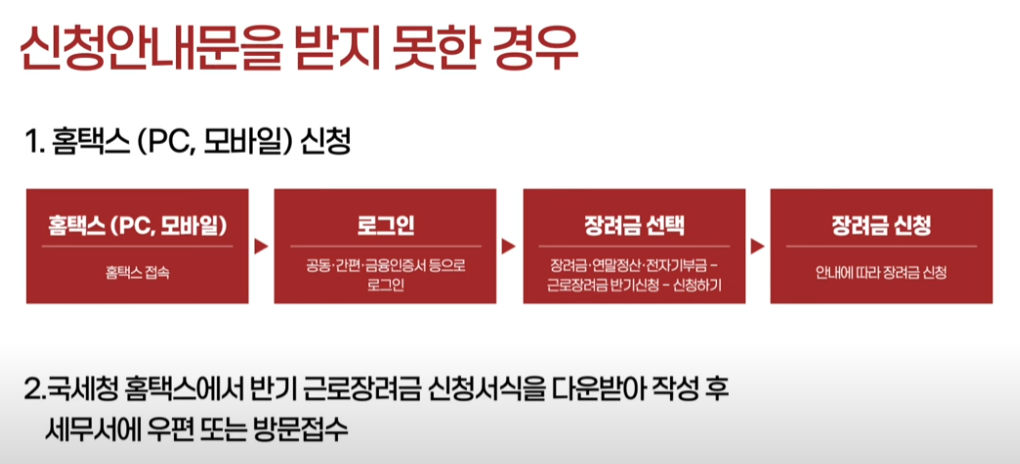 혹시 안내문이 오지 않았다고 해서 포기할 필요는 없습니다. 소득 요건과 재산 요건을 충족한다면 홈택스 PC, 홈택스 모바일 앱, 또는 서면으로 직접 신청할 수 있습니다. 자격 조건만 충족한다면 누구나 신청 가능하다는 점 기억해 두세요.