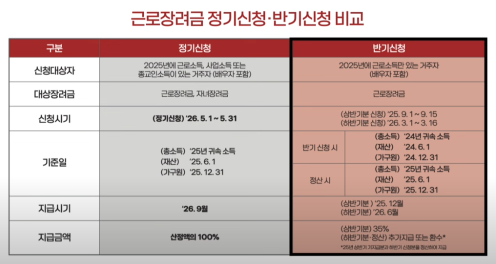 이 문제를 보완하기 위해 반기별 단기 신청 제도가 도입되었습니다. 상반기와 하반기로 나누어 근로소득만 있는 분들이 소득을 기준으로 신청할 수 있고, 지급 시기도 빨라졌습니다. 다만, 단기 신청은 상반기·하반기 중 한 번만 신청하면 됩니다. 신청을 놓쳤더라도 5월에 진행되는 정기 신청을 통해 다시 도전할 수 있으니 너무 걱정하지 않으셔도 됩니다.