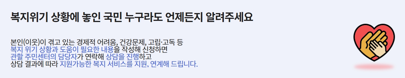 - 전화 신청: 관할 주민센터 또는 보건복지상담센터(129)를 통해 문의 및 접수