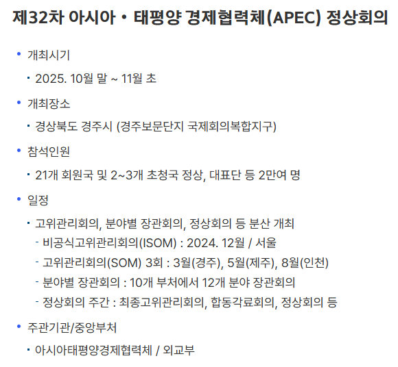 또한 대통령실은 관련 태스크포스(TF)를 꾸려 APEC 정상회의 준비에 전력하고 있어요. 회의 인프라뿐 아니라 문화행사, 경주 시민과의 연계 프로그램 등도 함께 준비 중이라고 하네요. 성공적인 개최를 위한 전방위적인 준비가 진행되고 있는 만큼, 기대해볼 만한 국제 행사로 주목받고 있어요.