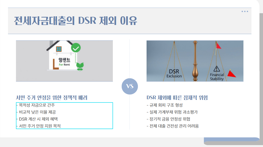 현행 제도에서는 전세자금대출을 서민 주거 안정을 위한 목적성 자금으로 간주합니다. 이로 인해 비교적 낮은 이율로 제공되고, DSR 계산 시 제외되는 혜택이 있죠. 그러나 이런 특례가 반복되면서 비율상으로는 규제가 적용되는 것처럼 보이지만, 실제 전체 대출 중 규제 비율은 낮은 수준에 머물게 됩니다.