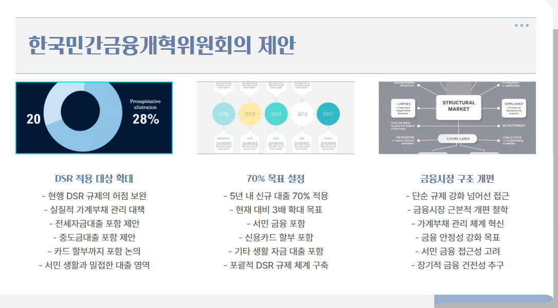 한국민간금융개혁위원회는 새로운 정부에 바라는 금융개혁과제로 30개 항목을 제시했습니다. 이 가운데 핵심으로 떠오른 것이 바로 DSR 적용 대상 확대입니다. 단순히 규제를 강화하자는 차원을 넘어, 금융시장의 구조를 근본적으로 개편하자는 철학이 깔려 있는 제안으로 해석됩니다.