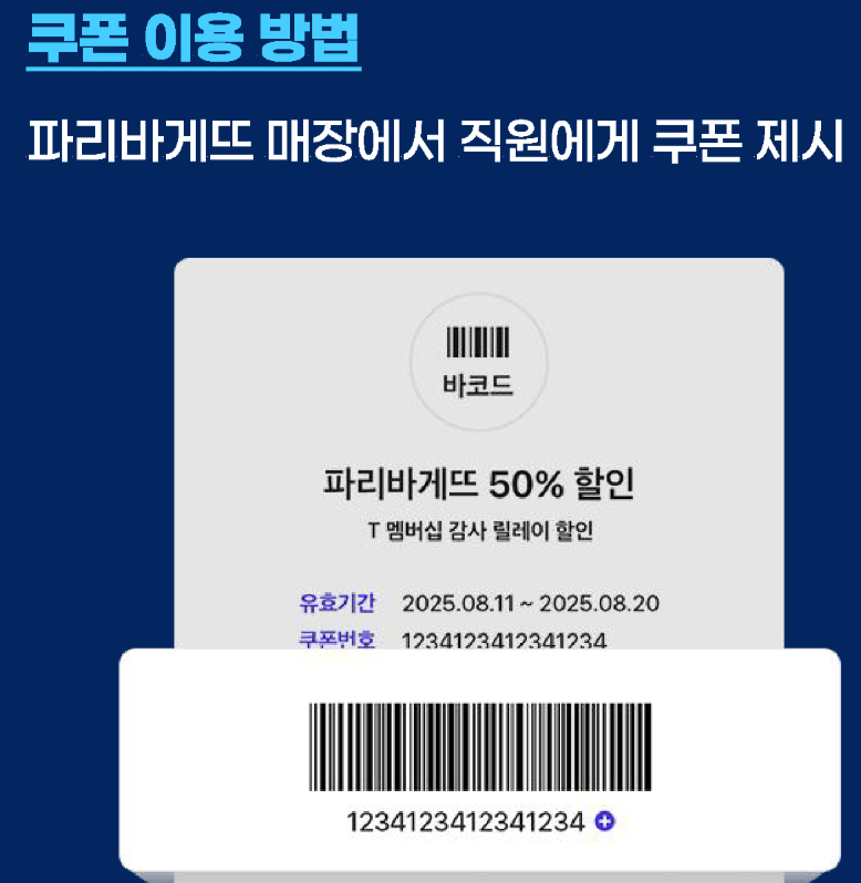 - 제시 방법 : 결제 시 T멤버십 앱 쿠폰 화면을 직접 직원에게 보여줘야 함