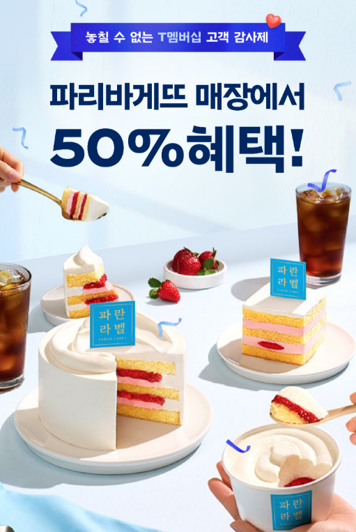 - 제공 내역 : 파리바게트 전 품목 50% 할인 쿠폰 (일부 품목 제외 가능)