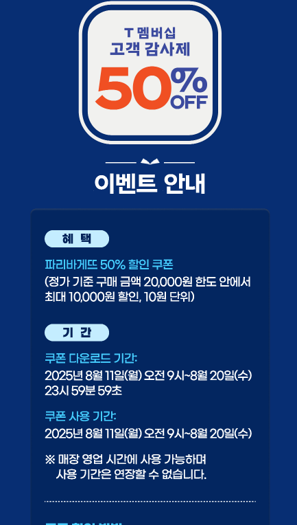 - 제공 내역 : 파리바게트 전 품목 50% 할인 쿠폰 (일부 품목 제외 가능)